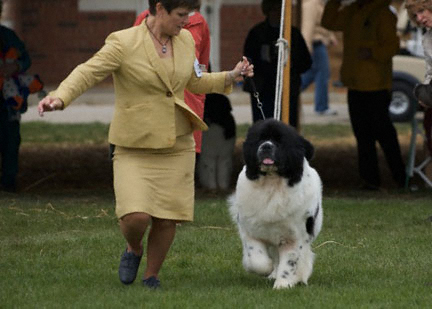 Michael encourages owners to be patient and to be willing to let their dog grow up. Too many people get their Newf puppy out too early. He remembers one client’s nine month old pup that he refused to take then because of her immaturity and lack of coat. He encouraged the owners to take her home, do some training and have fun, then talk to him later. Two years later he re-evaluated her and shortly thereafter took her to a BOW award at the NCA National. He encourages clients to listen to the advice of their handlers, but also to be wary of a handler who wants to run with a puppy from six months of age on. Very few giant breed pups are ready for the real competition as babies, and handlers should be producing results if they handle your dog.