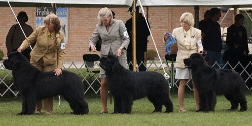 When bathing your Newfoundland, always use a good quality dog shampoo. These can be purchased at dog shows or in dog supply catalogs. I like to use a concentrated shampoo that I dilute appropriately. After you have your dog all lathered up, take a little extra time to give a good body massage. This makes for a good experience for the dog in getting a bath. Be sure to rinse the coat thoroughly, as any shampoo left in the coat can cause flaking and other problems. Following the bath, dry your potential show dog with a blow dryer. The more powerful ones shorten the time required! It is best to comb the dog in the direction the coat lays the entire time the drying process is occurring. This can help train the coat to lie flatter and eliminates dryer mats.